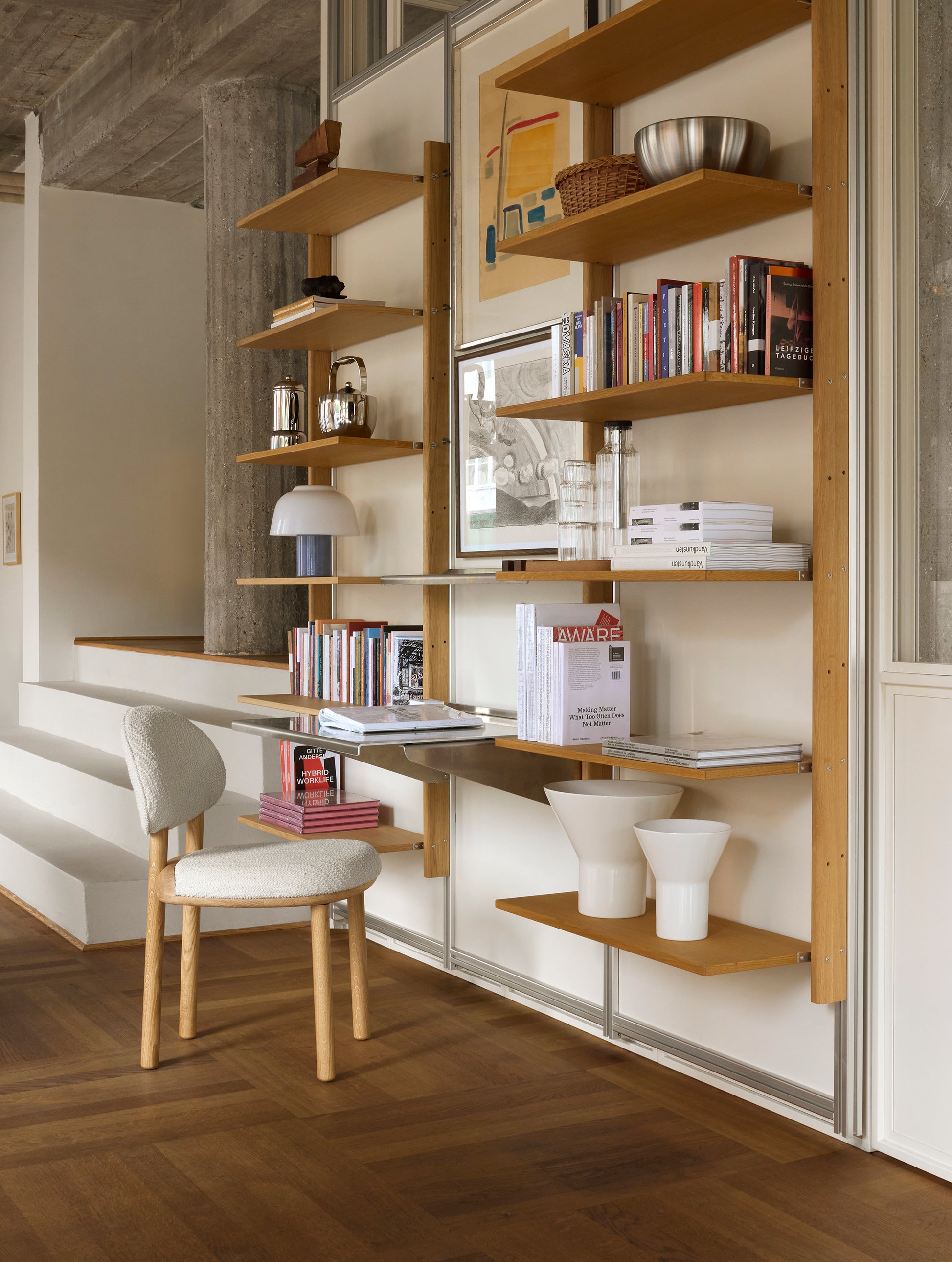 MOD is a versatile shelving and cabinet storage solution crafted to fit any environment - whether it's functioning as an elegant shelving system for the living room, a storage piece in the kitchen, or a stylish display in a shop or office space. The system consists of wall-mounted solid oak wood rails, with shelves available in both aluminum and oak wood and a cabinet in oak wood.